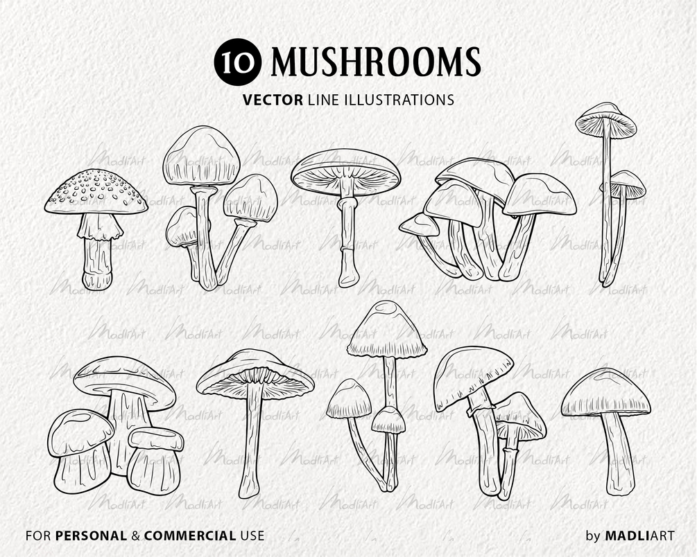 This is a collection of 10 Forest Mushroom Vector Illustrations. All illustrations come in high quality vector format with detailed line work and are hand-drawn by professional Illustrator.