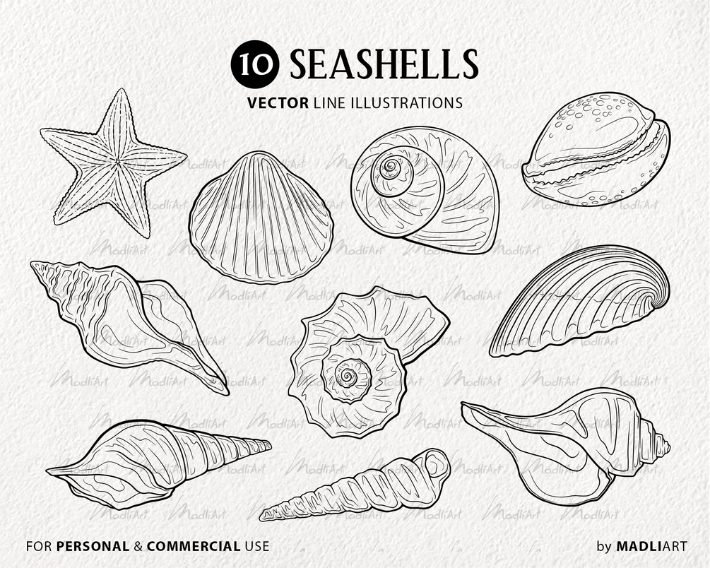 This is a collection of 10 Seashell Vector Illustrations. All illustrations come in high quality vector format with detailed line work and are hand-drawn by professional Illustrator.