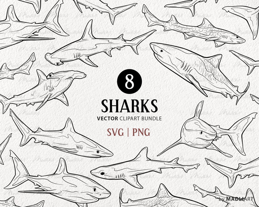 This is a collection of 8 Shark Vector Illustrations. This ocean animal SVG line art consists of: Great White Shark, Hammerhead Shark, Blue Shark, Tiger Shark, Leopard Shark and Smooth-hound Shark. All illustrations come in high quality vector format with detailed line work and are hand-drawn by professional Illustrator.