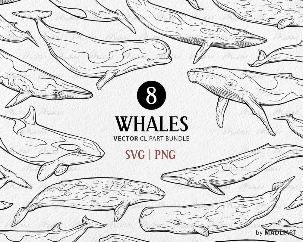 This is a collection of 8 Whale Vector Illustrations. This ocean animal SVG line art consists of: Humpback whale, Killer whale aka Orca, Blue Whale, Grey Whale, Sperm Whale, Beluga Whale, Minke whale and Bryde's whale. All illustrations come in high quality vector format with detailed line work and are hand-drawn by professional Illustrator.