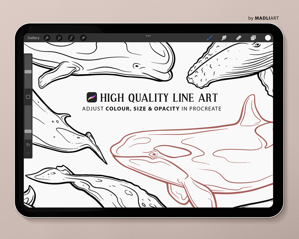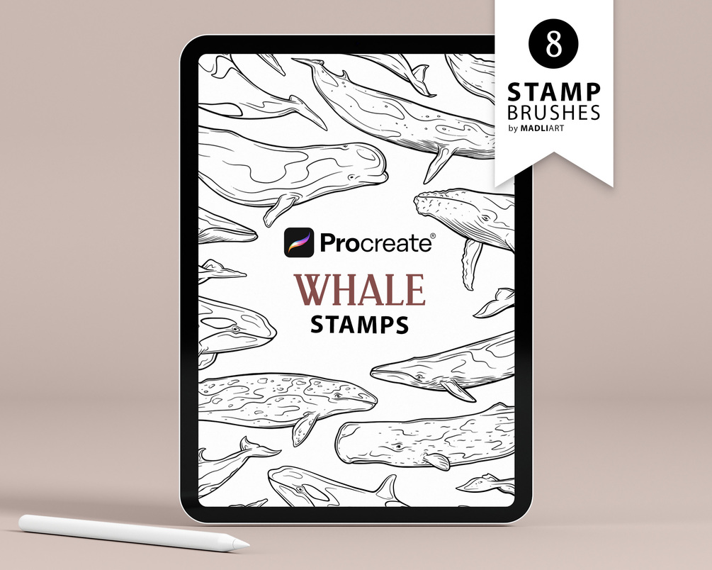 8 Whale Brush Stamps for Procreate. Line Art Stamps oHumpback whale, Killer whale aka Orca, Blue, Grey, Sperm, Beluga, Minke Whale. Ocean Animal Tattoo Design Stamps.